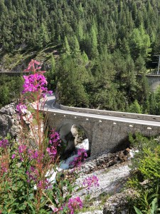 Der Wanderweg verlief abwechselnd im Schatten und wieder an der Sonne. Kiesweg und Waldweg wechselten sich ab, immer wieder durften wir uns an schönen Blumen am Wegrand erfreuen oder der Bahn zusehen, wie sie über ein Viadukt fuhr, im Berg verschwand um bald darauf weiter oben wieder aufzutauchen. Immer wieder fanden wir Infotafeln vor, die zum Bahnbau und bahn technische Infos vermittelten.
