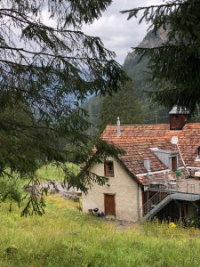 Bei Sonnenschein reisten wir von Bergün ab, als wir in Filisur aus dem Zug stiegen, regnete es. Ein steiles Kiesweglein führte uns vom Bahnhof ins Dorf hinunter zum Hotel Schöntal. Nachdem wir unser Zimmer bezogen hatten, machten wir uns auf einen Rundgang durch das Dorf und die nähere Umgebung. Eigentlich haben wir uns vorgestellt, den Nachmittag an einem schönen Plätzchen in der Natur lesend zu verbringen, doch dazu regnete es zu stark und wir haben statt dessen für unser Picknick Unterschlupf im winzigen Holzlager an einer Feuerstelle gefunden. Natürlich bietet ein Holzscheit als Unterlage nicht den gewünschten Sitzkonfort, doch wenigstens war es mehr oder weniger trocken zum Sitzen.