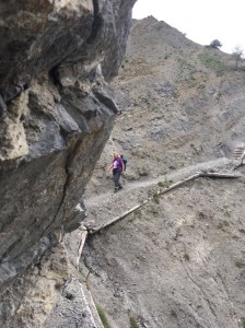 Initiative Leute mit Jenisberger Wurzeln haben diesen Weg vor ein paar Jahren wieder instand gestellt. Die Steilhänge sind jedoch ständig stark von Erosion betroffen und Lawinen setzen dem Weg auch immer wieder zu. Heute war der Weg zwar gut begehbar, doch an einigen Stellen waren die Stützbalken abgerutscht. Zwar sind an einigen Stellen Ketten vorhanden, an denen man sich festhalten kann. Zum Glück ist dieser Teil des Weges nicht allzu lang, danach gings wieder auf ganz schmalem Waldweg mit wesentlich weniger Absturzgefahr weiter.