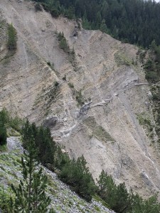 Den Blick immer schön auf den Boden vor unseren Füssen gerichtet, gingen wir mit aller Vorsicht darüber. Doch das beste Stück lag immer noch vor uns, die Rüfe mit dem schwindelerregendem Tiefblick. Kaum zu glauben, dass im 19. Jahrhundert Säumer auf diesem mühsamen und erschwerlichen Pfad das im Silber- Bergwerk bei Monstein geförderte Erz zur Schmelze nach Bellaluna transportierten. Heute ist der alte Fussweg zwischen Filisur und Jenisberg ein beliebter, jedoch abenteuerlicher Wanderweg, der sogar von einigen waghalsigen Bikern benutzt wird.