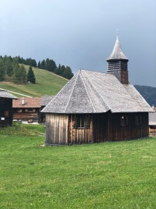 Lange Zeit war ich auch ganz alleine da, bis weitere Wanderer und zwei Biker dazukamen. Die Sonne brannte und mir wurde es zu heiss, so verzog ich mich mit meinem Buch ganz in der Nähe unter die Lärchen. Da verblieb ich, bis ich, zwar noch weit, das Donnern hörte. So machte ich mich an den kurzen Abstieg, ich wollte ja noch das Holzkirchlein besuchen.