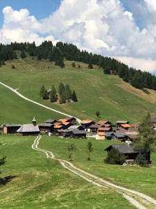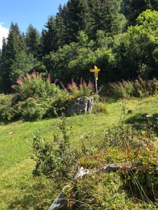 Nach der Pause führte ein schöner Bergwanderweg der dem historischen Wegverlauf entspricht, noch um einen Einschnitt herum und schon konnte ich einen Blick auf die braunen Holzhäuser und die kleine Kirche von Obermutten werfen. Dorf ist etwas übertrieben, es ist eher eine Siedlung. In wenigen Minuten betrat ich das Gasthaus Post, wo ich ein schönes Zimmer beziehen durfte. Den restlichen Nachmittag verbrachte ich dann auf der Sonnenterasse mit einem Buch wobei ich jedoch ständig jemanden für einen kurzen Schwatz fand.