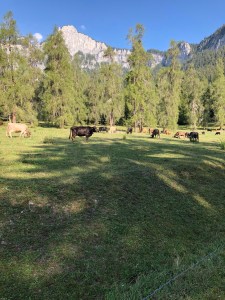 Am Sonntag startete ich in Tamins Dorf mit der ersten Etappe dieser 2-Tages Wanderung. Ich folge der Fahrstrasse aufwärts Richtung Norden. Es liegen ein paar hundert Höhenmeter Aufstieg vor mir. Bald komme ich zu einer weitflächigen Weide mit Kühen. Der Anblick dieser braunen und schwarzen Tiere, inmitten der grünen Weiden und interessanten Felsformationen eingekesselten Landschaft, bot ein schönes Bild.