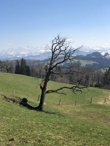 Der Bus ab Mosnang Dorf nach Mühlrüti war mit Schülern voll belegt. Es war kurz vor zwölf, sie waren alle auf dem Heimweg. In Mühlrüti war bald niemand mehr zu sehen, bis ich mich auf den Weg machte. Dabei folgte ich dem Wegweiser Toggenburger Höhenweg in Richtung St. Iddaburg. Es ging an Höfen vorbei aufwärts, und als ich auf der Kuppe angekommen war, wieder abwärts und am andern Hang wieder hoch. Ich war fasziniert von der prächtigen Sicht auf die Schneeberge.