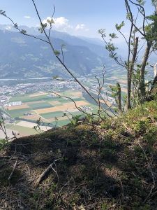Ein Wegweiser wies mich weiter hinauf, die Markierungen jedoch lagen am Boden, und ob sie an der richtigen Stelle liegen, weiss ich auch nicht. Es ist die Stelle, wo ich die Richtung ändern sollte, das heisst, statt Sicht auf den gegenüberliegenden hohen grünen Hügel (Vilan) sollte ich mich gegen Lanquart abdrehen und hinter der Helwand und Grossa Wang entlang weiterlaufen. Es lagen Unmengen von Ästen am Boden, da war kein Weg auszumachen, erst weiter oben traf ich wieder auf den richtigen Pfad, ich hätte eben noch ein kleines Stück weiterlaufen sollen und erst dann abdrehen. Doch nun gab es wieder genügend Markierungen an den Bäumen und zudem führt der schmale Weg nun auf weichem Waldboden weiter. Eigentlich hätte ich gerne eine Pause gemacht, doch kein gutes Plätzchen kam in Sicht.