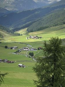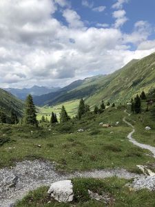 Je weiter ich ins Tal hinunter kam, desto wärmer wurde es wieder, doch hat es angefangen zu regnen. Nun musste ich die Regenjacke überziehen, das heisst schwitzen. Später, bei 2044m, führt der Wanderweg über die Brücke auf die andere Seite des Ducanbachs und danach geht es nochmals ein Stück aufwärts. Unmittelbar treffe ich wieder auf Wald und schlagartig ändert sich die Vegetation. Der Ducanbach nimmt den direkten Weg über den Felsen, wir wählen den Umweg dem Hang entlang. Die Lärchen geben bereits den Blick frei auf das grüne Sertigtal. Bald habe ich mein Ziel erreicht.