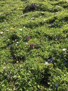 Über Alpwiesen führt der breite Weg angenehm aber stetig aufwärts, über diesen Weg soll früher das Heu auf Schlitten heruntergeholt worden sein. Das Heu ab der Fanezmeder soll von besonders guter Qualität sein. Da und dort war auch ein Murmmeli zu sehen, meist neugierige Jungtiere. Etwas weiter oben wird der Oberalpbach auf einer Brücke überquert, und schon sind ein paar Hütten zu erkennen, das muss bereits die Fanezmeder sein. Vorher aber erfreute ich mich an der Blumenpracht, es ist ein Glücksfall und dem vielen Regen zu verdanken, dass so eine Blumenvielfalt in dieser Jahreszeit noch vorzufinden ist.