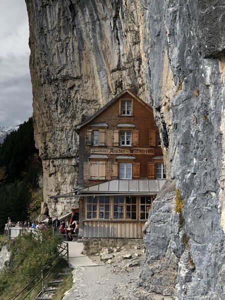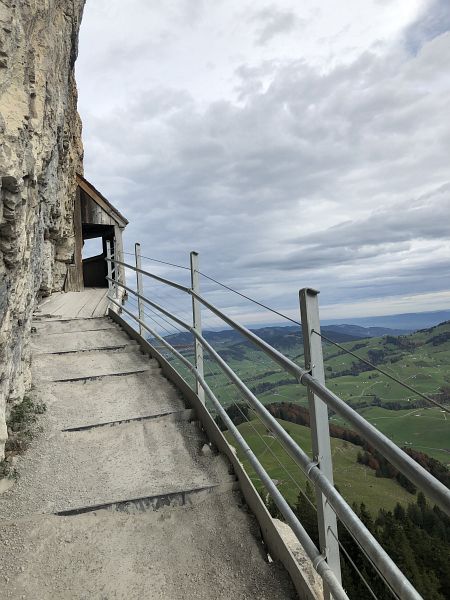 Der Ausgang oben bei der Bergstation führt zuerst in eine angebaute Panoramahalle mit Glaswänden und Sitzbänken, eine angenehme Art um anzukommen, moderne Toiletten befinden sich gleich daneben. Als erstes wollte ich zum Wildkirchli. Ein planierter Weg führt in zirka fünfzehn Minuten hinunter. Ich habe vorgängig ein wenig über diesen Ort gelesen, war dann aber an Ort und Stelle überwältigt von dem, was ich mit all meinen Sinnen an diesem speziellen Ort aufnehmen durfte. Zuerst war es die beeindruckende Atmosphäre in der Wildkirchli-Höhle, ich habe mir die Höhle nie so riesig vorgestellt. Trotz Beleuchtung war es recht düster darin, das verlieh dem Weg eine gewisse Mystik, zumal sich grad nur wenige Personen darin befanden. Am Höhlenausgang auf der anderen Seite steht die Rekonstruktion des ehemaligen Eremitenhäuschen, das nun als kleines Museum dient. Etwas weiter weg befindet sich die Höhlenkapelle. Auch da durfte ich einen Moment ungestört verweilen. Über eine Galerie entlang der Felswand gelangt man zum Berggasthaus Äscher, dem aller Welt bekannten Fotosujet. Und es schien mir, dass, all jene, die heute hier hinaufgekommen sind, da auf der Terrasse anzutreffen sind, denn erstaunlicherweise begegnete ich später, als ich am Äscher vorbeigegangen bin, keinem Dutzend Wanderer mehr. Ich bin nicht alleine wegen diesem Berggasthof hierhergekommen, auch wenn das an den Felsen angebaute Gebäude wirklich speziell ist. Doch gibt es weit mehr zu sehen hier oben. Die Aussicht alleine ist es wert zu kommen.