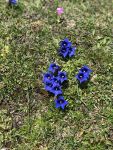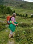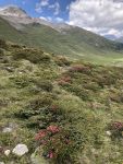 Ein breiter Alpweg ohne Steigung führt nach Süden, der führt auch nach Lü. Bald zweigt unser Weg links ab hinauf zur Fuorcla Funtana da S-charl. Der Bergwanderweg wird nun steiler, jedoch ungefährlich und gut zu begehen. Es scheint eine recht beliebte Wanderroute zu sein. Wir begegnen ein paar weiteren Wanderern, auch solchen, die in Gegenrichtung unterwegs waren. Ein paar Mal musste ich anhalten um kurz zu verschnaufen und die Berge rundherum zu betrachten, dieses beglückende Gefühl von Bergen umrundet zu sein habe ich in den letzten Monaten sehr vermisst. Mit meinen Blicken in die Gehrichtung versuchte ich, die Fuorcla, also den Übergang ins Val S-charl auszumachen. Es ging jedoch noch ein paar Mal um die Hügel herum. Später kamen wir an einem Skilift vorbei und hatten somit den höchsten Punkt fast erreicht. Die Fuorcla ist eigentlich eher eine grüne Hochebene und nicht das, was ich mich sonst gewohnt bin, eine schmale Kante auf der es gleich wieder steil herunter geht. Zum hinsitzen war es uns doch etwas zu kühl und wir beschlossen, erst weiter unten unsere Mittagspause zu halten. Gut gestärkt, denn wir hatten beide guten und genügend Proviant dabei, (man weiss ja nie), machten wir uns an den restlichen Abstieg zur Alp Astras. Bereits konnte ich Maya zeigen, wo das Naturwaldreservat God da Tamangur liegt. Diese Hangseite steht grad voll in ihrer Blumenpracht, oben waren es vermehrt die Enziane und weiter unten die Alpenrosen. Da konnten wir nicht widerstehen, ein paar Fotos zu machen und uns an den schönen Blumen zu freuen. Überhaupt habe ich noch nie so einen fülligen Alpfrühling erlebt, entweder war die Blütezeit schon vorbei bis ich in die Berge kam oder aber das Gras war noch braun vom erst kürzlich weggeschmolzen Schnee. Schade ist nur, dass ich die Blumennamen kaum kenne, das muss sich noch ändern.