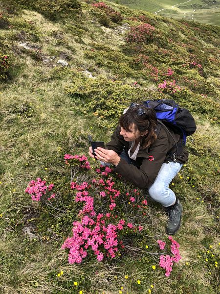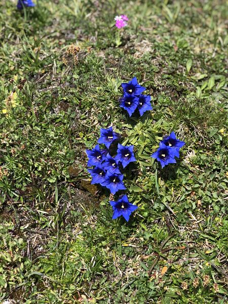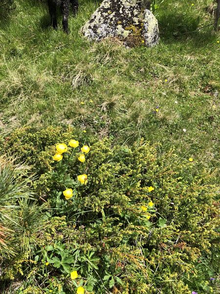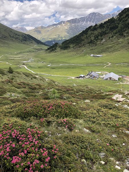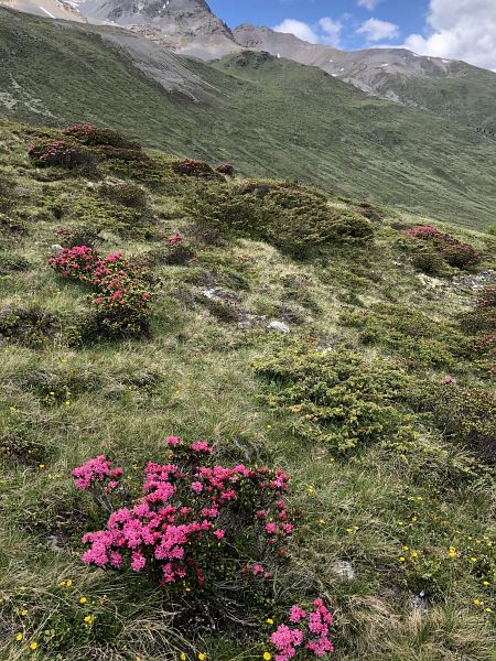 Ein breiter Alpweg ohne Steigung führt nach Süden, der führt auch nach Lü. Bald zweigt unser Weg links ab hinauf zur Fuorcla Funtana da S-charl. Der Bergwanderweg wird nun steiler, jedoch ungefährlich und gut zu begehen. Es scheint eine recht beliebte Wanderroute zu sein. Wir begegnen ein paar weiteren Wanderern, auch solchen, die in Gegenrichtung unterwegs waren. Ein paar Mal musste ich anhalten um kurz zu verschnaufen und die Berge rundherum zu betrachten, dieses beglückende Gefühl von Bergen umrundet zu sein habe ich in den letzten Monaten sehr vermisst. Mit meinen Blicken in die Gehrichtung versuchte ich, die Fuorcla, also den Übergang ins Val S-charl auszumachen. Es ging jedoch noch ein paar Mal um die Hügel herum. Später kamen wir an einem Skilift vorbei und hatten somit den höchsten Punkt fast erreicht. Die Fuorcla ist eigentlich eher eine grüne Hochebene und nicht das, was ich mich sonst gewohnt bin, eine schmale Kante auf der es gleich wieder steil herunter geht. Zum hinsitzen war es uns doch etwas zu kühl und wir beschlossen, erst weiter unten unsere Mittagspause zu halten. Gut gestärkt, denn wir hatten beide guten und genügend Proviant dabei, (man weiss ja nie), machten wir uns an den restlichen Abstieg zur Alp Astras. Bereits konnte ich Maya zeigen, wo das Naturwaldreservat God da Tamangur liegt. Diese Hangseite steht grad voll in ihrer Blumenpracht, oben waren es vermehrt die Enziane und weiter unten die Alpenrosen. Da konnten wir nicht widerstehen, ein paar Fotos zu machen und uns an den schönen Blumen zu freuen. Überhaupt habe ich noch nie so einen fülligen Alpfrühling erlebt, entweder war die Blütezeit schon vorbei bis ich in die Berge kam oder aber das Gras war noch braun vom erst kürzlich weggeschmolzen Schnee. Schade ist nur, dass ich die Blumennamen kaum kenne, das muss sich noch ändern.