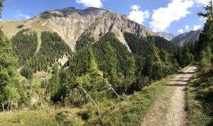 Deshalb machte ich mich bald wieder auf den Weg, ein Blick zur anderen Talseite hinüber zeigte, dass das «Zügli» inzwischen eingetroffen ist, im Gänsemarsch liefen die Besucher auf der sonnigen Seite ins Tal hinein. Wie froh bin ich doch, dass ich auf dieser Seite laufen darf und zudem noch im Schatten, der heutige Tag ist recht warm, obwohl es bereits September ist. Und dann hörte ich das Röhren der Hirsche, genau dafür nimmt man die ganzen Anstrengungen doch auf sich oder? Nein, natürlich nicht, man möchte ja auch noch welche sehen. Dort, wo andere mit ihren grossen Fernrohren stehen blieben, blickte ich ebenfalls in die Höhe, und sah…. NICHTS ☹, also keine Tiere. Nun ja, ich mag ebenso den Blick zur Bergkulisse, den Geruch nach Harz und Wald. Der reichhaltige Mischwald hat einiges zu bieten, Lärchen in Überzahl aber auch knorrige Föhren und junge Arven.