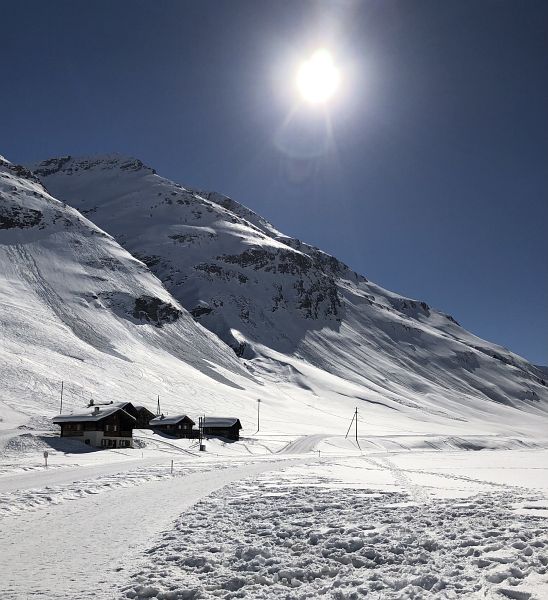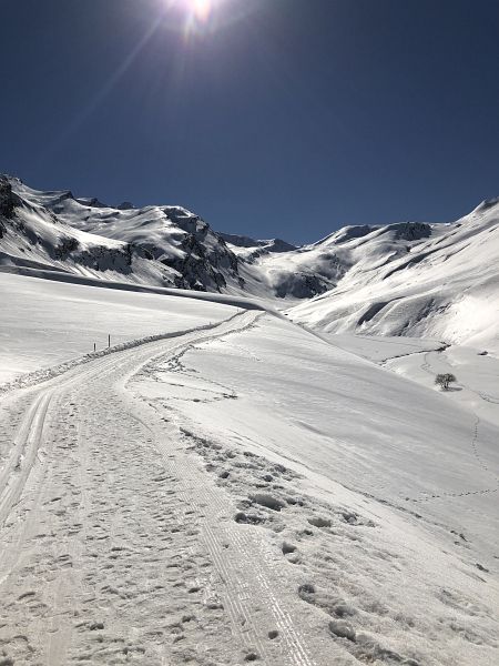 Bevor ich mich auf den Weg machte, verpflegte ich mich in der Skihütte noch vor dem Mittagsandrang von den Wintersportlern. Es war inzwischen fast elf Uhr und ich musste doch recht früh starten. Gut gestärkt lief ich los. Bald schon befand ich mich fast alleine auf dem Weg, da viele Leute nur ein kleines Stück ins Tal hineinlaufen, jedoch an Skitourengänger und Schneeschuhwanderern fehlte es nicht. Trotzdem, nicht zu vergleichen mit Orten im Unterland. Es knirschte der Schnee unter meinen Füssen, mein Blick schweifte ins Weite.