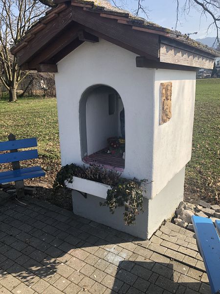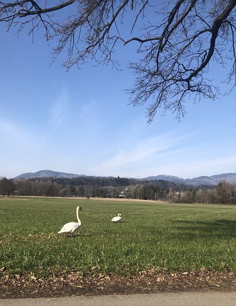 Gleich hinter der Grynau führt der Weg in den Wald hinein und steigt nun leicht an. Die Lindtebene mit dem Dorf Tuggen ist durch eine Hügelkette vom See getrennt. An einem sonnigen und aussichtsreichen Plätzchen mit Bänkli und Panoramatafel setzte ich mich für mein Mittagessen hin. Besonders warm war es nicht an jenem Tag, dafür sonnig und windstill. Das hatte einige Familien ins Freie gelockt, dank den Zufahrten und Parkmöglichkeiten auf dem Hügel sind sie zahlreich eingetroffen und haben sich mit vollgepackten Taschen und Säcken niedergelassen und waren am Bräteln. Ich setzte meinen Weg fort, der mich knapp zur Hälfte durch den Wald führt. Bis man diesen beim Golfplatz wieder verlassen kann und dann den Blick direkt auf den See erhält. Nun geht es abwärts dem Dorf Nuolen zu. Inzwischen war es Nachmittag und zu Zeiten ohne Pandemie wäre ich dort vielleicht irgendwo kurz eingekehrt. Voll in Gedanken an eine schöne Tasse Cappuchino erblickte mein Auge eine Tafel die Ice Cafés anpries, -juhui- da ist ein kleines Lädeli mit diversen Geschenkartikeln und freundlicher Verkäuferin und einer reich gefüllten Kühltruhe. Doch essen muss man draussen, das ist klar, ich fragte sie, ob es in der Nähe ein Bänkli gäbe, ja doch, meinte sie, noch ein kleines Stück weiter im Ried. Und das fand ich dann auch gleich bei einer Wegkappelle die dem Heiligen Bruder Klaus gewidmet ist. Ganz ungestört war ich dort aber nicht, zwei Schwäne verweilten gleich hinter mir auf der Wiese und unterhielten sich lautstark.