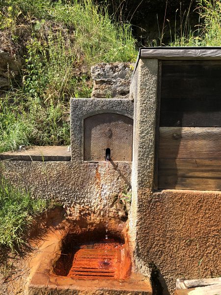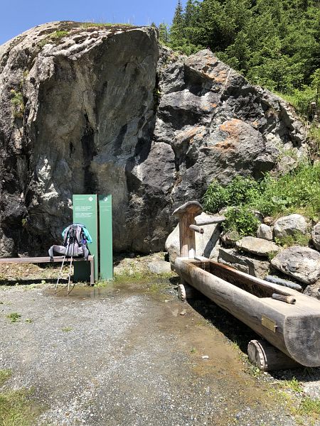 Nun begegnete ich häufig Trotti-Fahrern, die die Talfahrt von Motta Naluns nach Scuol auf diese Weise zurücklegten. Nicht alle schienen das Gerät gut im Griff zu haben. Etwas später durfte ich den Bike-/ und Trotti-Fahrweg, der direkt zur Talstation der Bergbahn und zum Bahnhof hinunterführt, verlassen und dem Wanderweg nach Scuol Dorf folgen. Bevor ich zum oberen alten Dorfteil kam, traf ich noch auf den Brunnen der Vi-Quelle und trank noch ausgiebig davon. Denn die vielen Mineralquellen in dieser Gegend gelten als das „blaue Gold des Engadins“ (siehe Blogbericht über die Mineralquellen des Engadins), somit sollte man sich die Möglichkeit, an einem der vielen Brunnen davon zu kosten, nicht entgehen lassen.