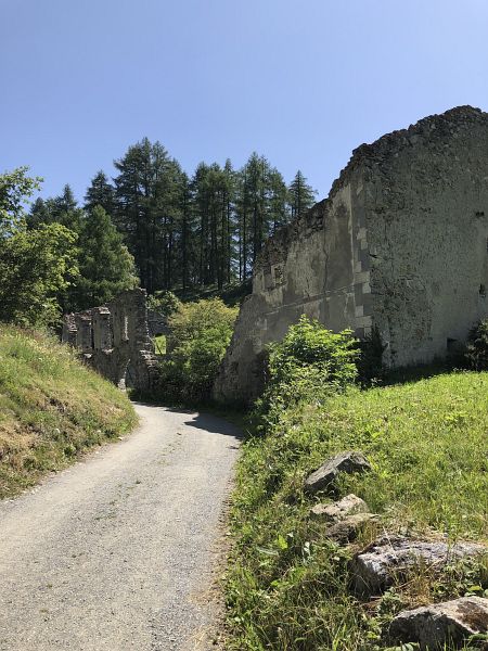 Wenig später kam ich an der Ruine Chanoua vorbei, dabei soll es sich um die Überreste einer alten Sust handeln, es soll hier einmal eine ganze Häusergruppe mit Kapelle gestanden haben, an der damaligen Verbindungsstrasse «via Imperiala» Como-Tirol. Das Wahrzeichen von Ardez bildet jedoch die Schlossruine Steinsberg (Siehe Blogbericht Ardez und Ruine Steinsberg) dem Felshügel am Dorfrand. Dieser stattete ich im 2019 bereits einen Besuch ab, an diesem Tag betrachtete ich sie nur von oben herab.