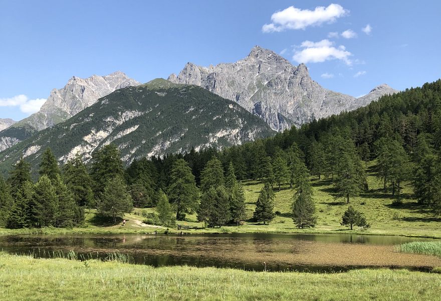 Als ich am späten Vormittag in Tarasp-Fontana aus dem Bus stieg, lief ich sogleich zum Schloss hoch, nur hinein konnte ich nicht, die Führungen finden nachmittags statt. Ich folgte dem Wegweiser nach Avrona, und nicht dem direkten Weg zum Lai Nair. Ich wollte noch zum Aussichtspunkt «Bellavista», dieser Name versprach keinesfalls zu viel, es war wirklich ein wunderbarer Platz mit toller Weitsicht. Anschliessend führt der Weg durch den Arvenwald, es ist eine Naturstrasse, doch leider mit regem Verkehr, es gib weiter oben noch einen Parkplatz, so dass man es nicht mehr weit zum See hat, zudem scheint dies auch die Zufahrt nach Avrona zu sein und dort gibt es einen kleinen Campingplatz.