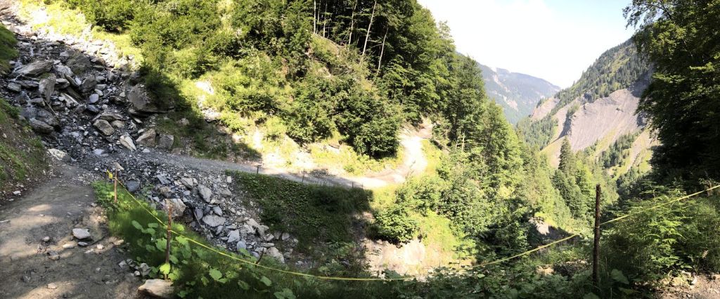 Der ursprüngliche Wegverlauf kurz nach der Alp Sässli ist aufgrund von Hangrutschen gesperrt, dies vermutlich schon seit längerer Zeit, doch die Umleitung ist gut markiert. Der alternative Wegverlauf ist aber recht matschig, führt wieder etwas abwärts und später über Geröll wieder aufwärts bis zur Wasserfassung Gufelbach, wo man den Bach auf einer festen Brücke überquert. Bereits sehe ich einen der Wasserfälle vor mir, nun ist es nicht mehr weit bis zum Ziel meiner Wanderung.