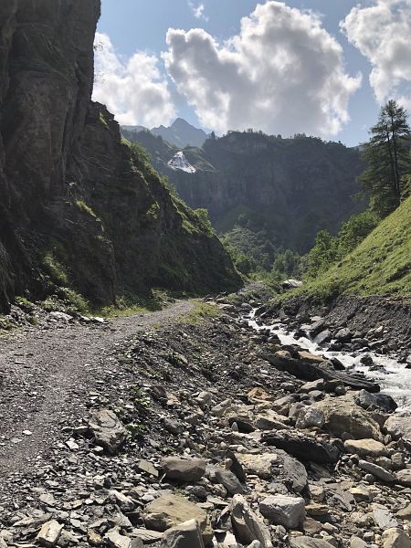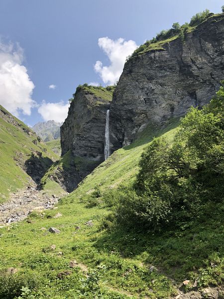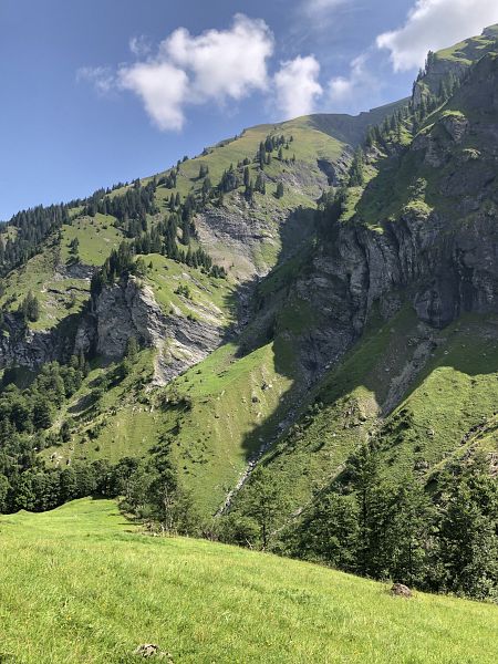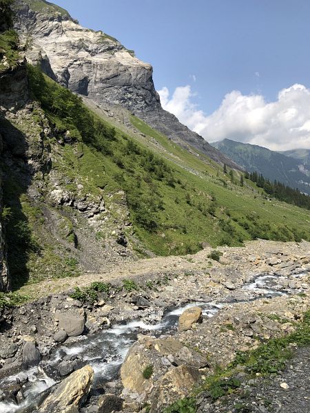 Dann wurde es Zeit, mich auf den Rückweg zu machen, stressen muss man da aber nicht, es gibt stündliche Busverbindungen bis am späteren Abend. Einen Weg in Gegenrichtung zu laufen, ist gleich nochmals anders, da man eine andere Sicht hat, so war der Rückweg genauso imposant wie der Hinweg mit dem Blick zu den steilen Hängen. Zurück im Dorf reichte mir die Zeit noch für eine Einkehr, so dass ich dem Ort wirtschaftlich doch noch etwas Kleines einbrachte. Danach genoss ich nochmals die Fahrt im Postauto und nahm mir vor, wieder zu kommen, vielleicht sogar einmal im Winter mit Schnee.