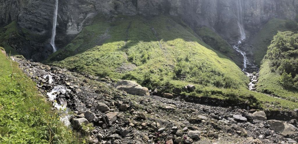 Von allen Seiten stürzt Wasser in unterschiedlichen Tönen über die Felsen herab, schliesst man die Augen, kann man hören, dass sich die Geräusche immer wieder leicht ändern. Ich habe noch nie so etwas erlebt. Etwas oberhalb der Brücke setzte ich mich auf einen Stein, dort hatte ich Sicht direkt auf den Piltschinabachfall, den Sässbachfall und den Muttenbachfall. Ich blieb etwa eine Stunde und genoss das einmalige Naturschauspiel. Natürlich waren auch andere Wanderer vor Ort, die das ebenfalls so taten, es gab genug Platz für alle, einige stiegen weiter hoch, andere setzten sich unten beim Wasser hin.