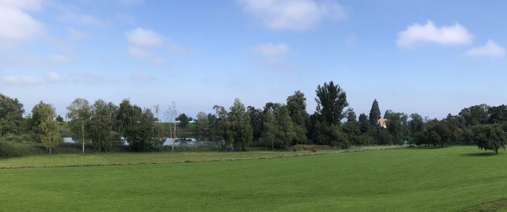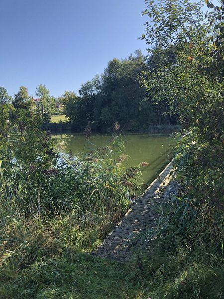 Etwas später lief ich ein Stück neben der Autobahn her, konnte diese dann über eine Brücke überqueren und auf der anderen Seite zum Schloss Sulzberg mit Schlossweiher aufsteigen. Dort plante ich zu rasten und Znüni zu essen. Doch der Zugang zu den beiden Weihern ist untersagt, sie stehen unter Naturschutz, zudem sind Schloss und Weiher in Privatbesitz. Also musste ich weiterlaufen, fand dann nach einer guten Viertelstunde ein Bänkli mit Blick auf die beiden Weiher, die Stadt St. Gallen und den Bodensee im Hintergrund.