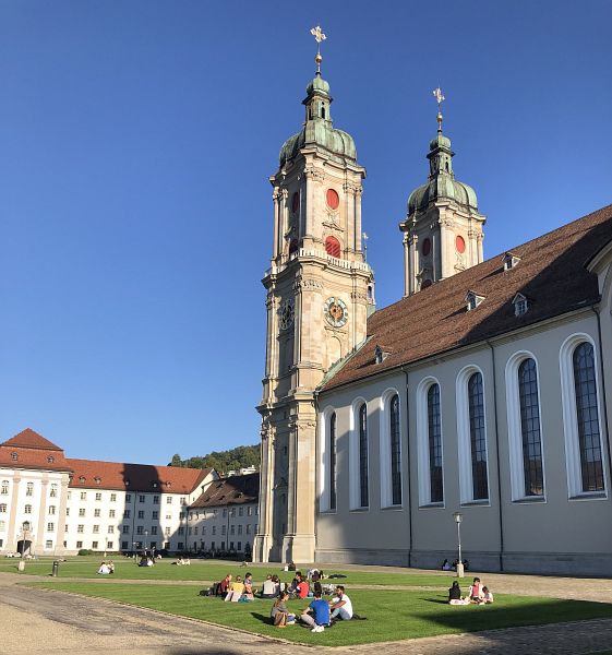 Das nächste Wegstück folgt eine kurze Zeit der Goldach, einem sehr schönen Wegstück. Später folgte noch ein kräfteraubender Anstieg bis zum höchstgelegenen Punkt des Tages (Postautohaltestelle Schaugenhof), danach geht es abwärts in Siedlungsgebiet, ich näherte mich der Stadt St. Gallen. Beim Sportplatz in der Nähe von St. Fiden setzte, respektive legte ich mich auf eine Bank am Schatten und ruhte mich nochmals aus. Danach lief ich ins Stadtzentrum und durch die Altstadt zum Klosterbezirk. Schön fand ich, dass der Wegverlauf in die Stadt hinein teilweise etwas abseits über kleine Pfade entlang Bachrinnsalen und durch schönes Wohnquartier führt. Doch irgendwann war ich dann doch mitten im Stadtzentrum mit all seinem Verkehr angelangt und folgte den Schildern zum Kloster.