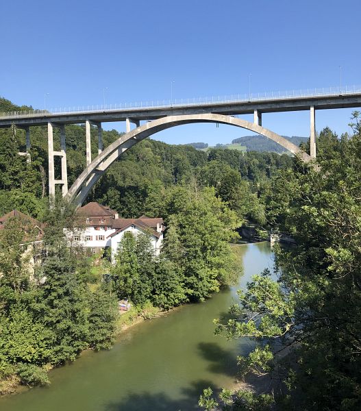 Als ich mich wieder zum Weitergehen motivieren konnte, führte mich der Weg über Felder und Wiesen, durch mehrere Dörfer und dann steil hinunter zur Martinsbrücke über die Goldach. Eine Infotafel schildert, wie gefährlich die Querung des Tobels früher für die Pilger gewesen sein musste. Nun, dank der Brücke ist heutzutage der Übergang von einer Seite des Tobels zur andern zumindest für die Fahrzeuge ungefährlich, sie kommen aber leider mit solch hohem Tempo daher, dass ich mich spurten musste, um an dieser unübersichtlichen Stelle zweimal die Strasse unbeschadet überqueren zu können. Unvorstellbar, wie es einmal sein könnte, wenn die Motorfahrzeuge alle elektrobetrieben sind und geräuschlos daherkommen!