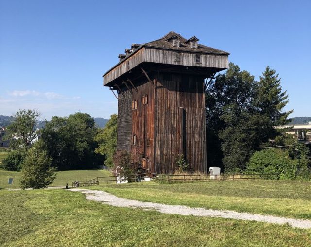 Danach führt der Weg längere Zeit durch Wohnquartier bis zur grossen Grünfläche mit den zwei Burgweihern. Dieses Areal ist erst seit 2019 öffentlich zugänglich. Die Weiher selbst sind zum Schutz eingezäunt. Etwas verwundert bemerkte ich den Holzturm daneben, was stellt dieser nur dar, ein Wohnturm wohl kaum. Schade, dass ich keine Infotafel dazu vorfand. Doch Google sei Dank, nun weiss ich mehr darüber, es ist der fast 200 Jahre alte Tröcknerturm, der in der Blütezeit der Textilindustrie errichtet wurde um die frisch gefärbten Textilien zu trocknen.