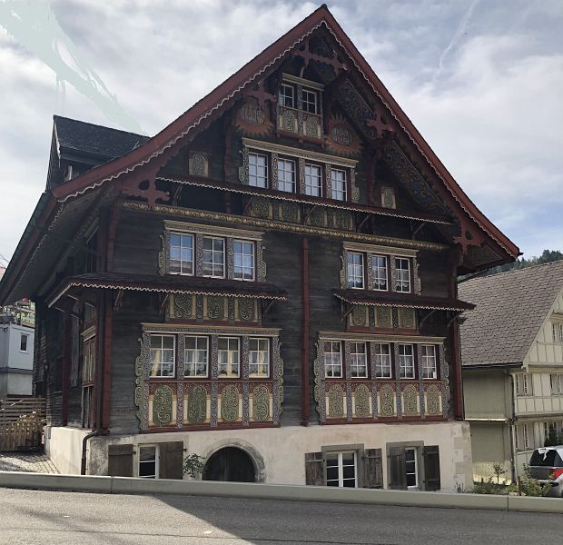 Zwei Routen Jakobsweg sollen hier zusammentreffen, jene des Voralberger-Appenzellerweges von Rankweil und jene von Rorschach. Ich besuchte nur kurz die Probstei und machte mich gleich wieder an den Aufstieg nach Hofstetten und war gespannt auf das Haus «Bädli», an dem ich vorher noch vorbeikommen soll. Ein Haus mit einer wunderschönen Fassadenbemalung im Rokoko-Stil, das an der Wende von 17. Zum 18. Jh. erbaut wurde. Nach einem weiteren Stück steilem Wiesenweg erreiche ich den Weiler Hofstetten, mit den bedeutsamsten Häusereinheiten des Toggenburgs. Es sind Holzbauten eines Bregenzerwälder Zimmermanns mit Giebelinschriften aus dem Jahr 1684. Bald treffe ich auf Niederwil, einem weiterer Weiler. Nachdem ich ein Waldstück mit Bach gequert habe, fand ich ein schönes Plätzchen, halb Sonne, halb Schatten und machte eine Pause.