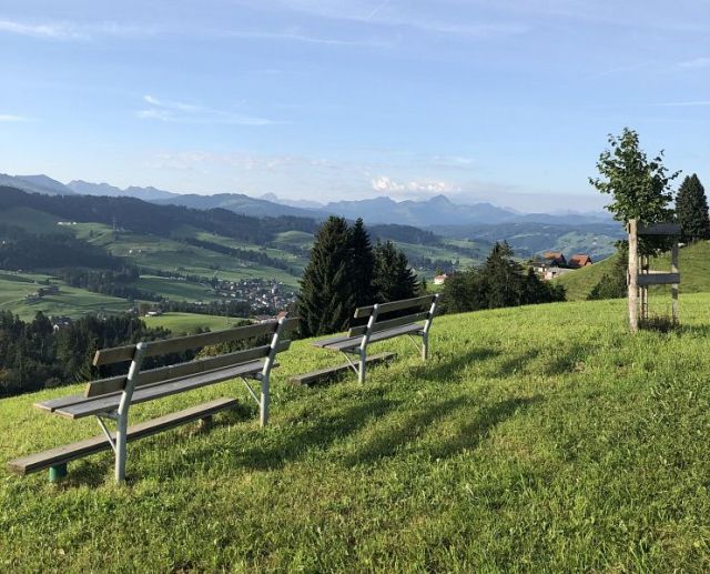 Von der Haltestelle Schwellbrunn, Risi laufe ich noch etwas weiter hinauf und erreiche schon bald den höchsten Punkt dieses Tages auf 1083 m.ü.M. Ich ziehe am Gasthaus vorbei, das seinen Ruhetag hat und finde weiter vorne, nachdem ich auch den Wegweiser Höhi passiert habe, eine Bank zum hinsetzen und die Aussicht zu geniessen. Weiter geht es über Wiesen und Weiden entlang der Hügelkette mit Aussicht auf das Alpstein, die Churfirsten und weit hinten, etwas bedeckt, weitere Berge, vermutlich die Bündner Berge.