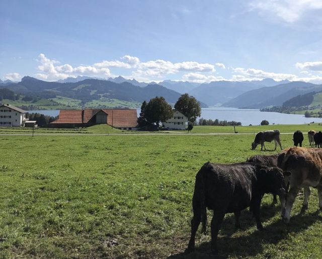 Mein Weg führt hinunter zur Teufelsbrücke, einer historischen Bogenbrücke, die Einsiedeln mit dem Etzelpass verbindet. Danach durfte ich ein kleines Stück über Feld und Wiesen laufen, bis es dann wieder auf Asphalt weiterging. Immer weniger macht es mir etwas aus, immer mehr finde ich meinen Rhythmus und meine innere Ruhe.