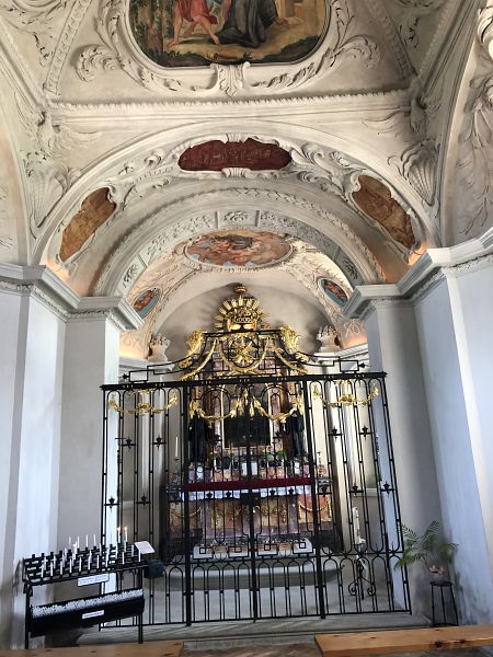 Am frühen Nachmittag kam ich in Rapperswil an. Bei diesem Wetter eine günstige Gelegenheit, ohne grosse Menschenmassen an der Uferpromenade entlang zu laufen. Von der hinteren Seite stieg ich hinauf zum Schloss und zur Kirche St. Johann mit den beiden ungleichen romanisch-gotischen Türmen. Nebenan steht die Liebfrauenkappelle. Und da ich ja auf Pilgertour bin, stattete ich beiden einen Besuch ab. Als ich mich auf den Weg zum Bahnhof machte, entdeckte ich das Kloster und trat noch in die Kapelle und die Antoniusgrotte ein.
