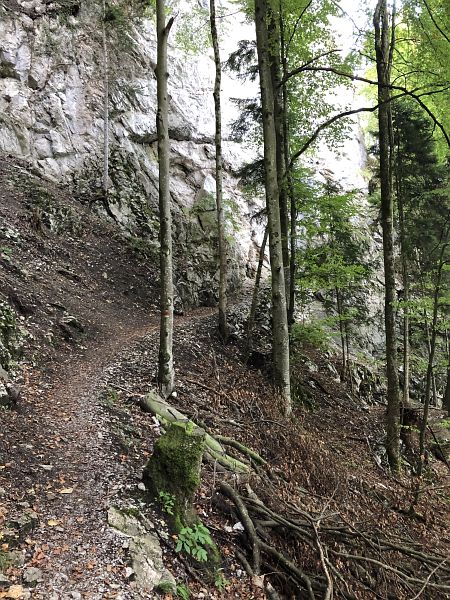 In den Genuss von wärmenden Sonnenstrahlen kam ich nur kurz, bald verlief mein Weg wieder im Schatten, doch da ich sehr bald in den Wald eintrat, war das nicht weiter tragisch. Warm bekam ich trotzdem bald, es ging stetig aufwärts und wie ich gelesen habe, ist dieses Wegstück technisch etwas herausfordernder, als all die bisherigen Wegstücke.