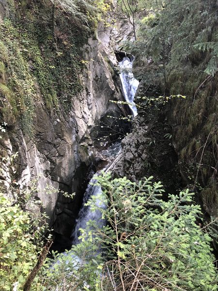 Steinig und schmal führt der Weg dem Felsen entlang stetig aufwärts, als die Abzweigung nach Emmeten kam, verlies ich den offiziellen Jakobsweg und folgte der Route 2 «Trans Swiss Trail», die direkt zum See hinunterführt. Ein steiler Abstieg stand bevor, dafür aber auch das absolut schönste Wegstück des Tages, über Brücken und Treppen entlang mehreren Wasserfällen und Gletschermühlen gelangte ich hinunter zum See wo sich ein Picknickplatz und auch ein Kompotoi befindet.