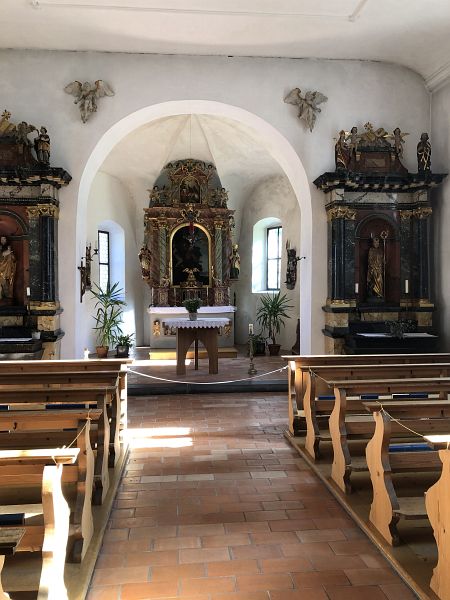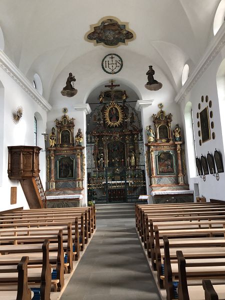 Übernachten könnten Pilger bei den Dominikanerinnen im Kloster Bethanien in St. Niklausen. Das dazugehörige Gästehaus soll eine Quelle zum aufzutanken oder um zu Gott zu finden sein und man könnte dort eine Woche in Stille verbringen. Die Klosterkirche empfand ich nach meinem Geschmack zu kühl und zu modern, daher blieb ich nicht lange drinnen, sondern lief weiter hinauf zur Kapelle St. Niklausen mit ihrem freistehenden Turm.