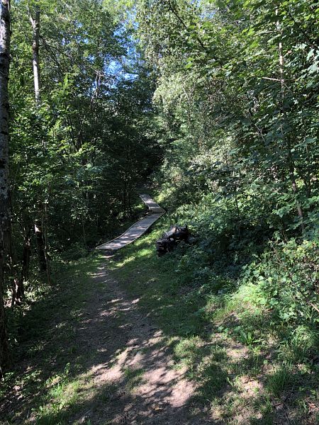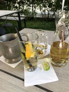 Der Abstieg nach Trun verlief wieder mehrheitlich auf Hartbelag und dazu wärmte die Nachmittagssonne. So suchte ich gleich eine Gaststätte auf. «Garten offen» stand auf der Tafel vor dem Hotel Casa Tödi. Doch wie kommt man nun in diesen Garten? Ganz einfach, dieser liegt gegenüber dem Haus, hinter einer Pergola versteckt und sobald man die Glocke entdeckt hat, kann man auch bestellen. Ich liess mich von dem hausgemachten Eistee überraschen, (frisch aufgegossener Tee mit Eiswürfel zum kühlen und Holundersirup zum süssen). Danach war ich wieder gestärkt um noch den Rest meines Weges fortzusetzen.
