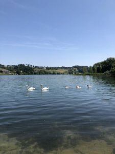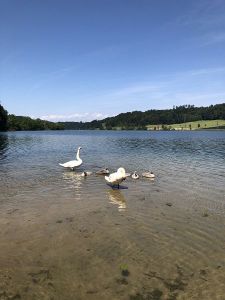 Gut gestärkt starte ich offiziell die Etappe 8: Nochmals folgt ein steiler Abstieg über Treppenstufen bis ich unten am See zu einer sehr schönen Bucht kam. Der sandige Strand lockte mich ins Wasser, doch nur mit den Füssen, ich habe keine Badehose dabei und sowieso sollten die Wasservögel nicht gestört werden. Die Schwäne wie die Enten führten ihre Jungschar aus und die Elternvögel wären durch mein Bad kaum begeistert gewesen. Das Fussbad tat aber trotzdem gut.