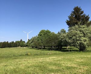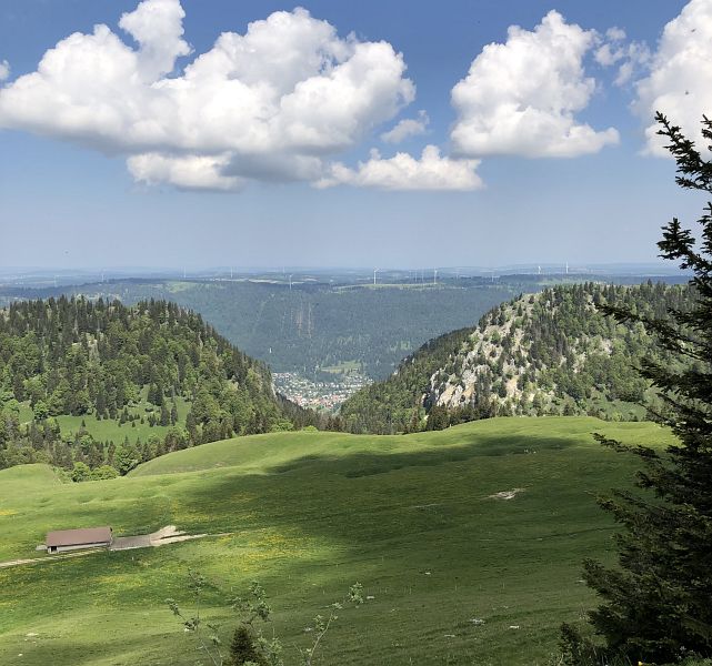 Gut ausgeruht mache ich mich wieder auf den Weg. Als erstes geht es hinauf zum Mont Crosin, dem Gebirgspass auf 1227m ü. M. auf dem heute ein Windpark betrieben wird. Der Weg führt zuerst durch den Wald und dann weiter oben eher flach auf einem breiten Kiesweg entlang. Kurz bevor der Weg wieder über Weideland führt, bei Chalet-Neuf, gibt es eine Buvette mit einer netten, berndeutsch sprechende Bauersfrau und einer verschmusten Katze. Da durfte ich meinen Durst löschen.