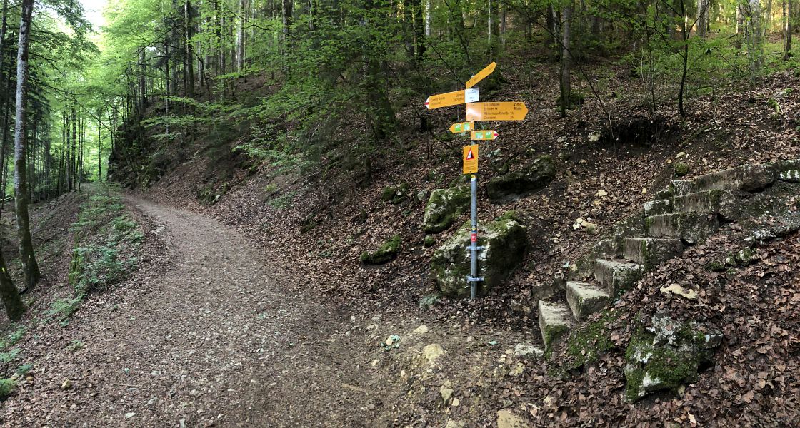 Endlich ist es soweit, mein Wanderabenteuer ViaBerna darf beginnen. An den grossen Rucksack und die Bergschuhe muss ich mich erst wieder gewöhnen. Die Tour beginnt gleich mit einem Anstieg, zuerst durch Wohngebiet und dann später im Wald bis zu einer Anhöhe mit Rastplatz, wo ich mir eine erste Pause gönnte.
