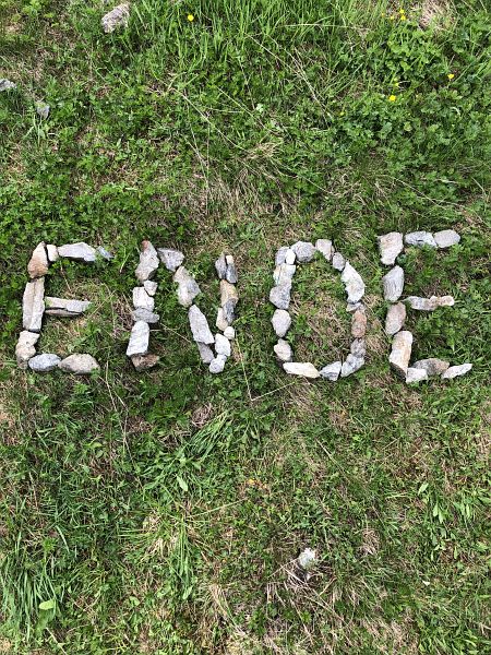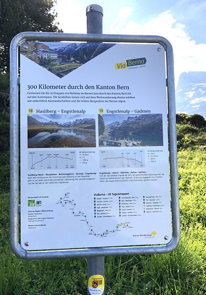 Die Fahrstrasse muss zweimal überquert und zweimal muss ihr kurz gefolgt werden, und schon ist man oben am grossen Parkplatz vor dem Restaurant Susten Kulm angelangt. Biker und Motorradfahrer machen Selfies mit der blauen Tafel im Hintergrund. Ich mache es ihnen gleich, jedoch mit dem Zielstein der ViaBerna Weitwanderung. Die Infotafel ist vom Schnee umgefallen und noch nicht wieder aufgestellt.