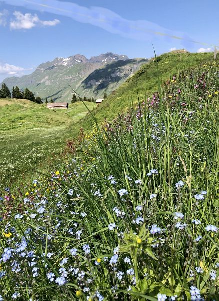 Zuerst darf ich einem Alpweg folgen, bis dann ein schöner Bergwanderweg weiterführt. Auf dem gegenüberliegenden Bergkamm kommt die Tannalp wieder in Sicht und weiter vorne der Alpentower auf Planplatten Hasliberg. Man läuft also irgendwie im Kreis, wechselt einfach die Bergkette.