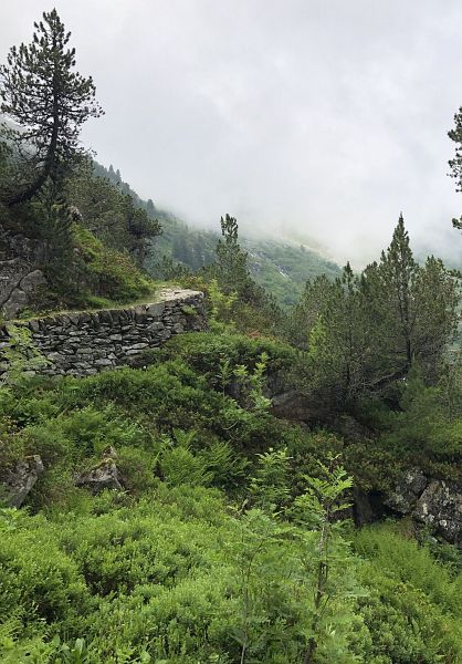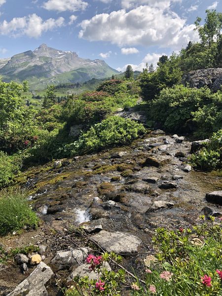 Etwas später tangiert der Wanderweg fast die Passtrasse und es hat eine Postautohaltestelle dort. Doch bei den wenigen Kursen über den Pass ist diese kaum von Nutzen. Nach einer Alpsiedlung wird die Uferseite der Steinwasser gewechselt, eine Schaf-und Ziegenweide darf gequert werden und dann geht es steiler aufwärts.