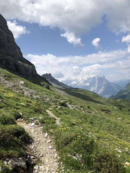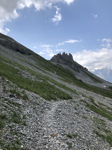 Fast horizontal zwar, muss eine abschüssige Bergflanke gequert werden, einmal musste ich sogar nach einem Wasserlauf eine Kieshalde hinaufkriechen. Das letzte Stück bis zum Sätteli ist dann noch richtig steil, aber unproblematisch.