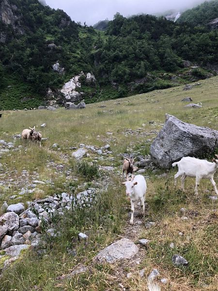 Ich wusste nicht, was die Tiere von mir erwarteten, eine grössere Ziege kam mich freudig begrüssen und leckte meine Hand. Dann aber ein lautes Määääh und die ganze Herde kam angerannt, vor allem viele Schafe. Ich musste sie mit Geräuschen und meinen Stöcken vertreiben. Die eine Ziege begleitete mich noch ein Stück und liess dann auch von mir ab.