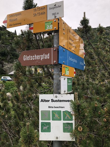 Gleich hinter dem Berghotel führt der Wanderweg weiter zum Pass hinauf, zuerst über angeschwemmtes Geröll, dann auf dem Trasse des alten Sustenweges. Lange ist die Sicht auf den Steinsee und den spärlichen Rest vom Steingletscher gegeben. Der Lärm der Motorfahrzeuge, entlang der Passstrasse ist nicht mehr zu überhören, willkommen in der Realität des 21. Jahrhunderts.