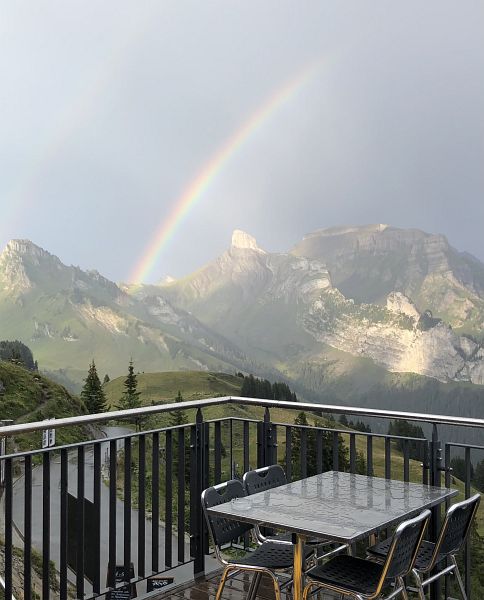 Mir wars recht so, um die Mittagszeit bereits dort einzutreffen. Wie zu erwarten wurde das Wetter am Nachmittag sehr wechselhaft, mal windig und frisch und dann schien wieder die Sonne. Ich wechselte von der Sonnenterasse in die Innenräume und wieder hinaus. Staunte nicht schlecht, wie viele auswärtige Berggänger am Nachmittag erst vorbeikamen und noch bis zum First laufen wollten und dies bei aufziehenden Gewitterwolken.