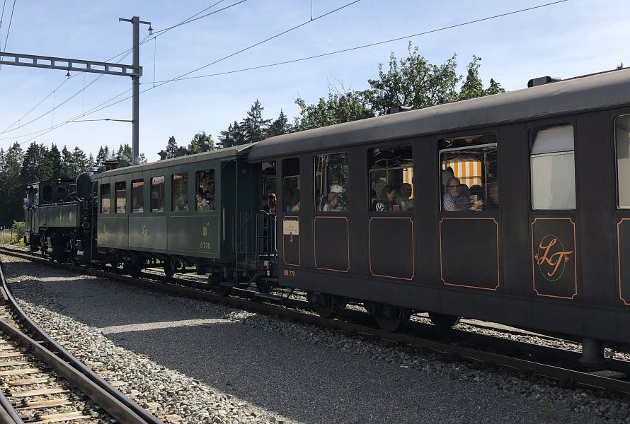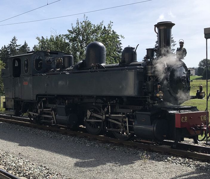 Nach der willkommenen Pause mit Kaffee und Kuchen ging es wieder weiter, immer sachte aufwärts. An dieser Strecke gibt es immer wieder Zughaltestellen, es ist somit möglich, nur Teilstücke zu wandern. Demzufolge sind viele Familien und Senioren unterwegs. Auf der Hochebene waren dann auch alle Rastplätze belegt. In Prépetitjean fuhr grad die Dampflokomotive mit den Nostalgiewagen los.