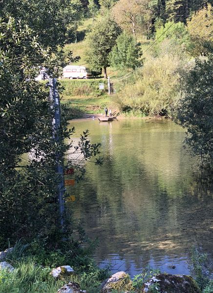Jetzt erst sah ich auch die Tafel mit der Bedienungsanleitung für die Fähre. Man müsse an der Kurbel weiter oben drehen, um das Boot heranzuholen, danach soll eine Person das Boot festhalten, währenddem die andern einsteigen. Doch was mache ich dann alleine?