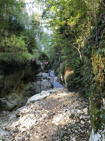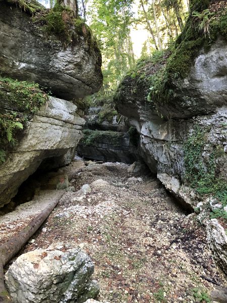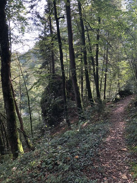 Die Signalisation für den Wanderweg ignorierte ich und nahm den direkteren Weg durch das Wohnquartiere, an jenem Morgen bereits mit etwas wärmender Sonne. Und schon befand ich mich in der Schlucht, auf gutem Wanderweg der Sorne entlang. Etwas später, bei Les Forges, muss ein Stück der Fahrstrasse entlang gegangen werden, und danach zweigt wieder ein Wanderweg ab.