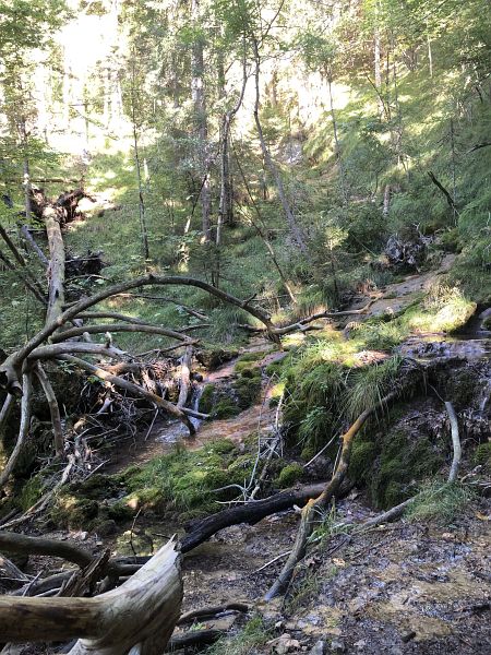 Der Lac Vert ist ebenfalls ein Juwel in dieser Gegend. Ein guter Weg führt daran vorbei, doch bald einmal ist es dann leider fertig mit guten Wegverhältnissen. Um weiterzukommen muss man hoch zur Fahrstrasse. Eine Brücke oder Steg über die Sorne, die hier wenig Strömung hat, sucht man vergebens. Der kurze steile Aufstieg zur Strasse hoch war etwas schwierig, da das Gelände abgerutscht ist. Schuhabdrücke zeigten an, dass hier schon andere aufgestiegen sind. Ein paar gut verwurzelte Sträucher halfen mir, mich hochzuarbeiten und gaben immer wieder festen Stand.