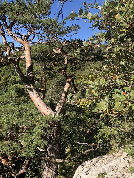Den Eingang in die Combe Fabet habe ich eher zufällig gewählt, denn eigentlich wollte ich einem anderen Weg folgen, jenem der Route 91, dessen Eingang ein paar Meter daneben wäre, den ich jedoch übersehen habe. Sofort war ich vom Weg durch das ausgetrocknete Bachbett und gesäumt von ausgewaschenen Felsen so begeistert, dass ich erst viel später merkte, dass ich mich auf einem anderen Weg, als geplant befand.